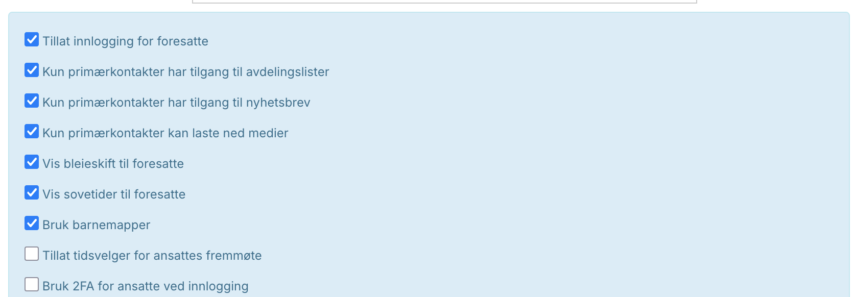 Her kan dere huke av for at kun primærkontakter kan lese nyhetsbrev, se avdelingslister og laste ned bilder.