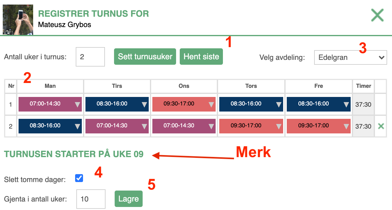 Merk at turnusen starter i uken vi var i da vi trykket på «Sett opp turnus».