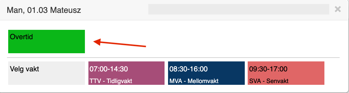 Så lenge det over stemmer får vi opp ett nytt valg som heter «Overtid» når vi trykker på de enkelte dagene. Det er ikke mulig å føre overtid flere dager omgangen.