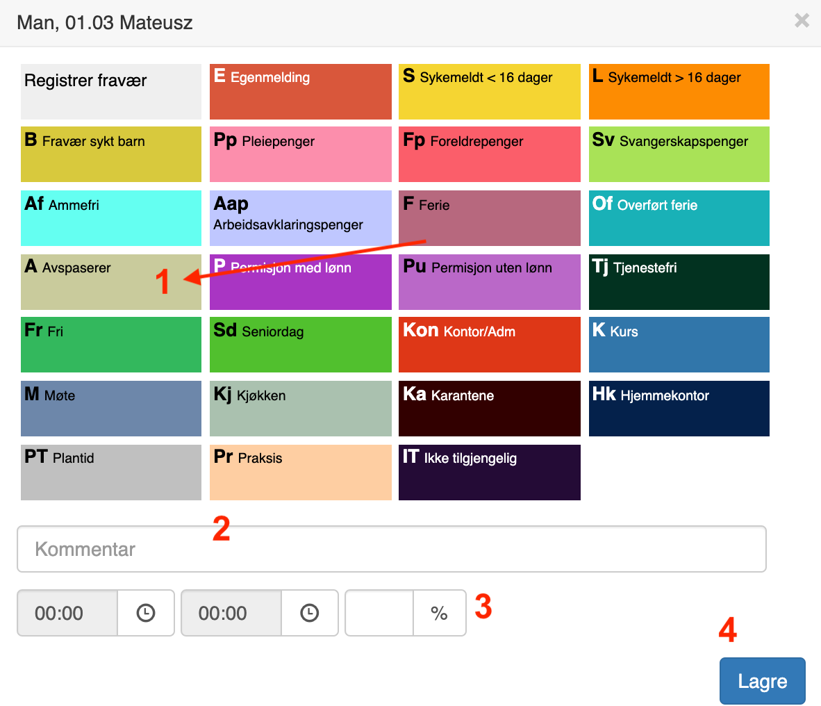 - Legg inn tider for når den gjelder, dersom du skal legge inn at du avspaserer Hele dagen ikke legg inn noe tidspunkt.