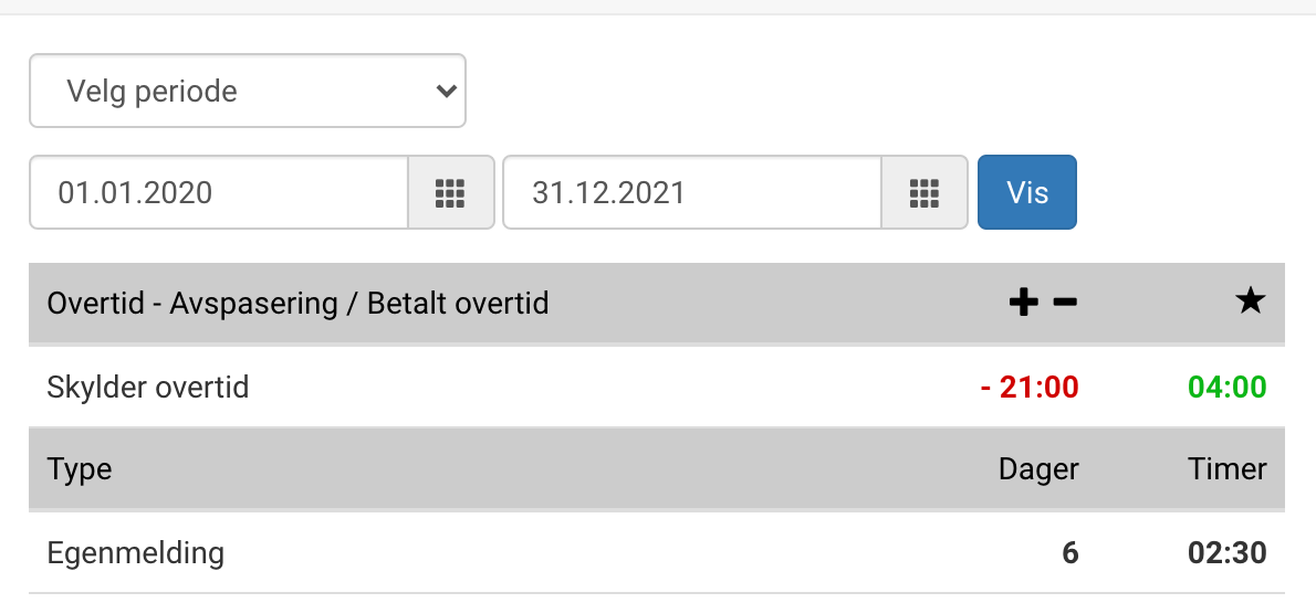 +/- viser om du «skylder» eller har avspasering til gode. Dersom tallet er i minus(rød) «skylder» du overtid og dersom den er i pluss(grønn) har du avspasering til gode. Stjernen vise «Betalt overtid».